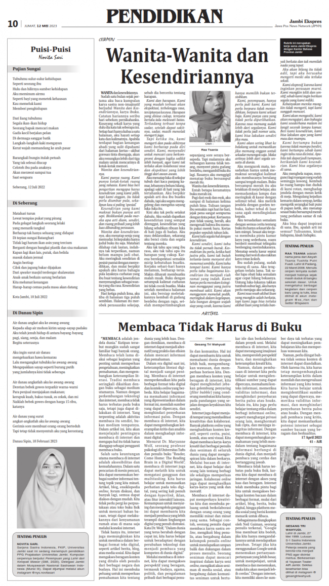 Laporan pemuatan karya pada rubrik Pendidikan di Harian Pagi Jambi Ekspres edisi Jumat, 12 Mei 2023. Cerpen: Raa Tsania Puisi: Novita Sari Artikel: Gesang Tri Wahyudi Selamat kepada para penulis. Salam literasi!