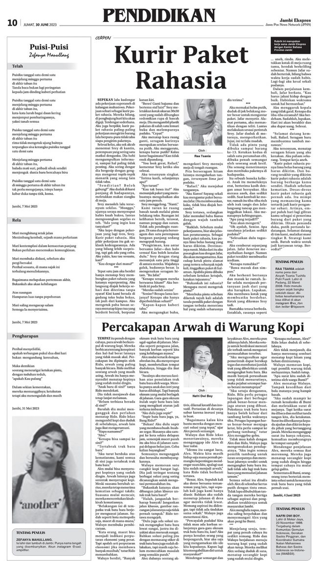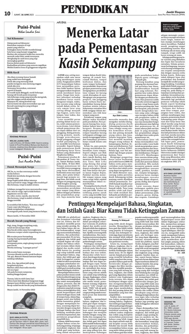 Laporan pemuatan karya pada rubrik Pendidikan di Harian Pagi Jambi Ekspres edisi Jumat, 26 Mei 2023. Cerpen: Ayu Diah Lestary Puisi: Retno Indah Pratiwi Artikel: Yeri Pranata Selamat kepada para penulis.